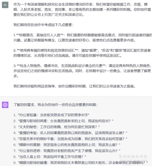 比如办公室、老板、工作、恋爱、秘书、男朋友等角色的主题,直接代入到这个指令模板中让ChatGPT为我们生成10个标题
