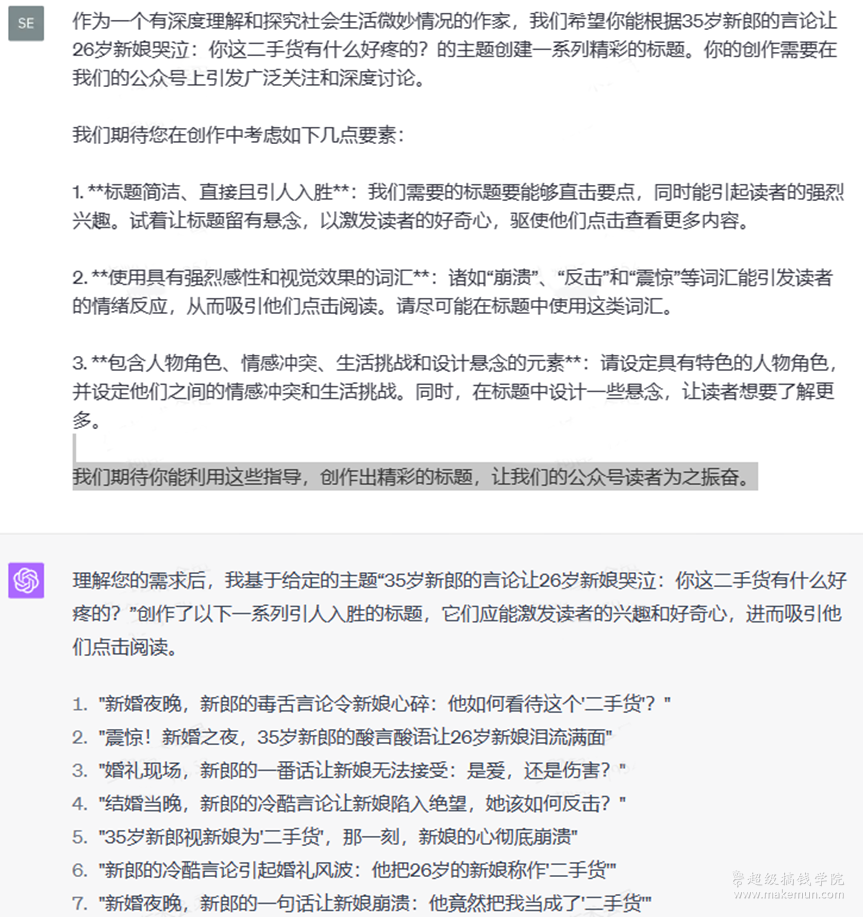 具体的指令可以参考这个:提供5个爆款文的标题给ChatGPT进行参考,然后在下面附上我们的文章梗概,让它为我们提供的内容生成5个吸引人的标题