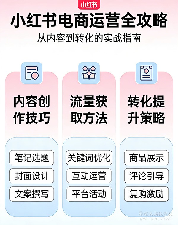 小红书电商从零开始运营课程,这个资源看起来挺全面的啊!从基础的开店流程到高阶的选品技巧、数据分析、内容创作都有涵盖,简直是小红书电商运营的全套指南。课程内容很系统,从账号设置、店铺装修这些基础操作开始,到选品、数据分析工具使用、内容创作技巧,再到挂车、发货售后等实际操作,形成了一个完整的运营闭环。对于想要入门小红书电商的朋友来说,这个课程应该能提供很大帮助。学习电商运营需要理论和实践相结合,希望这个课程能帮助大家在小红书平台上取得成功!