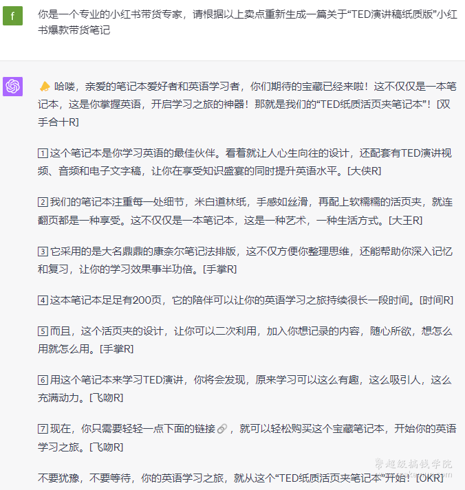 这样通过ChatGPT既可以快速生成文案,又能保证笔记的质量,对于想要做小红书的同学来说,堪称开挂!