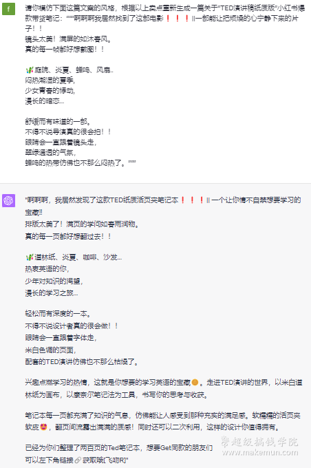 如果我们想换种语言风格,还可以把我们喜欢的文案复制给ChatGPT,让它模仿这种文案风格来写一篇带货笔记。