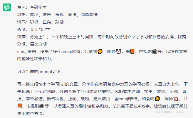 随后ChatGPT就会对我提供的内容样本进行分析,并给出它的分析结果,以及可以生成这篇文章的prompt: