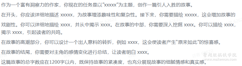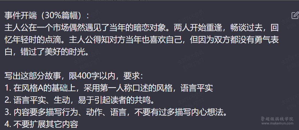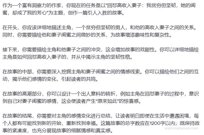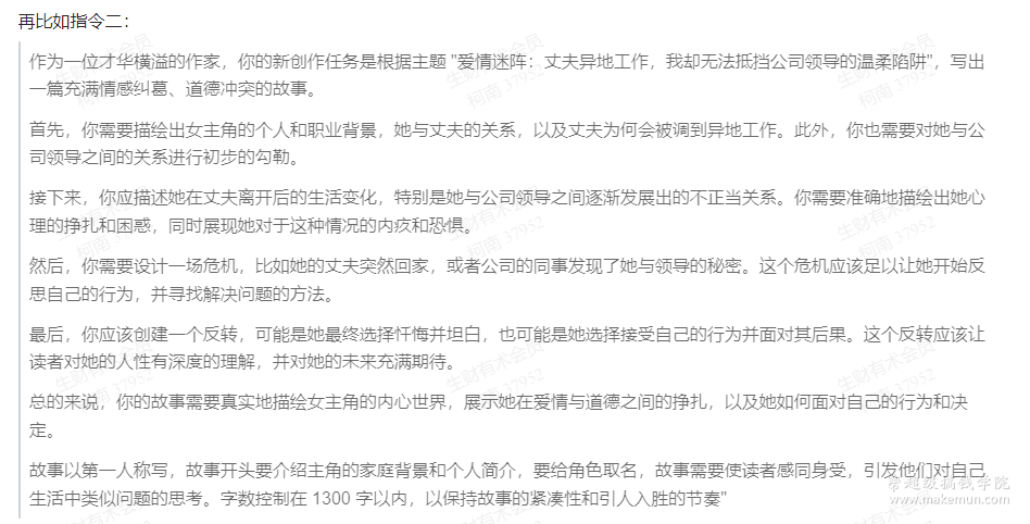 但是在这种写作过程中,我们经常会遇到一个问题,一旦字数比较多的话,ChatGPT生成的内容质量就没那么高了,经常会生成一些与情节无关的废话来凑字数,而且字数一般到1000字左右的时候,文章就结束了。